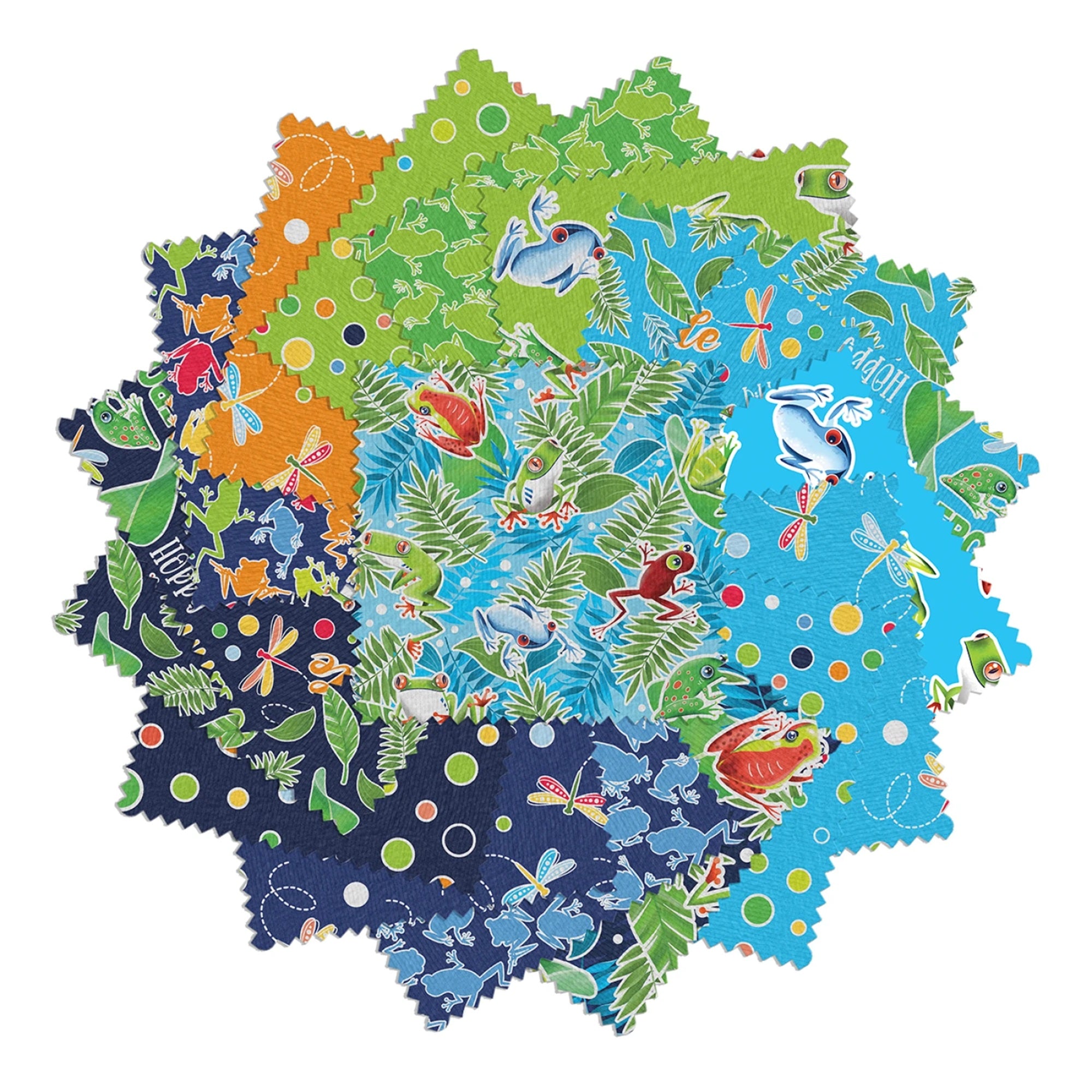 This vibrant fabric bundle features 5-inch squares in a lively 'Rainforest Glow' design, showcasing a colorful array of tropical leaves, playful frogs, and whimsical dragonflies. Each square bursts with bright hues of green, blue, orange, and more, creating a dynamic and cheerful pattern perfect for quilting, crafting, or sewing projects that aim to bring a touch of the jungle's exuberance into any creation.